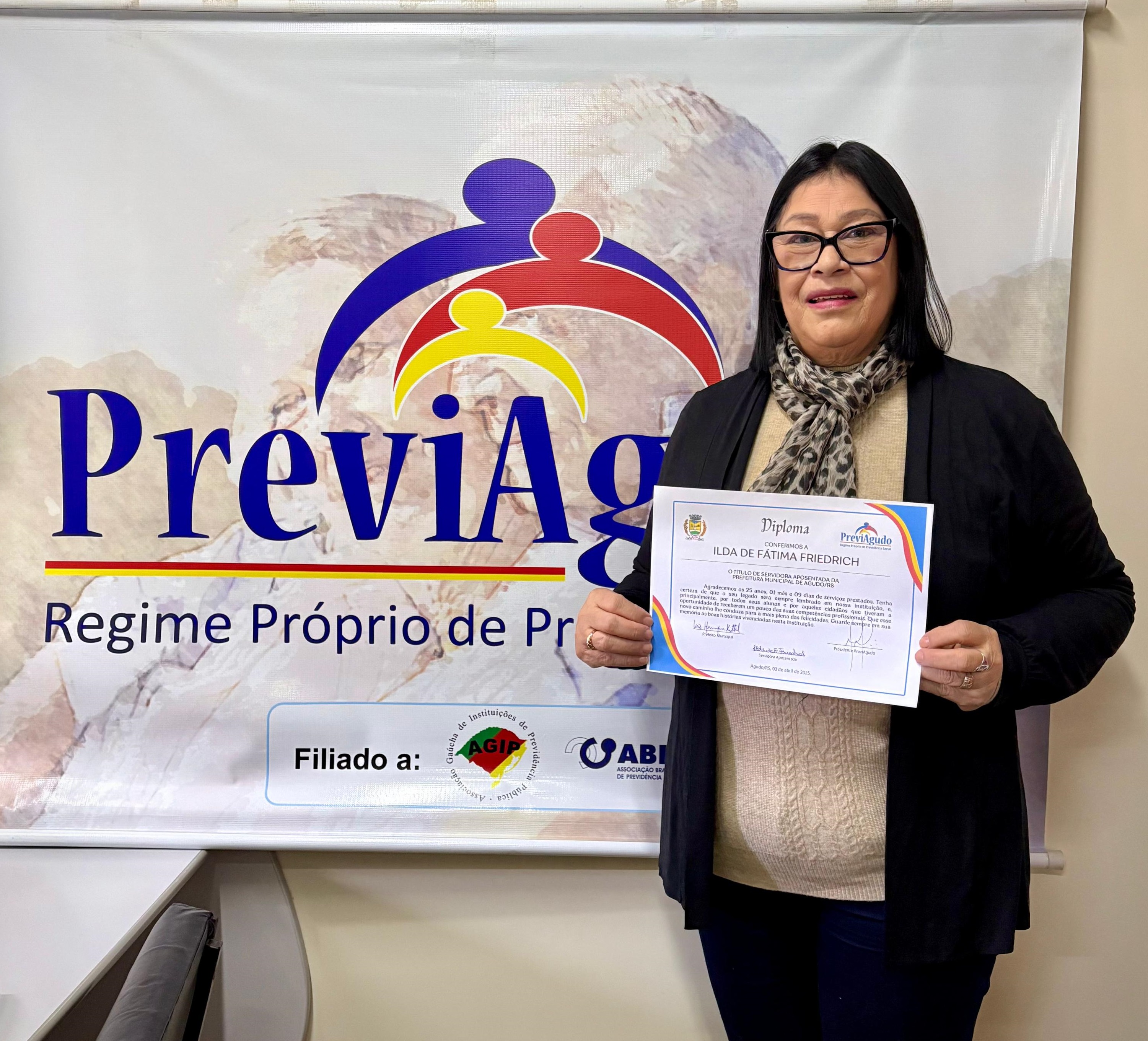 O Presidente do Previagudo Marcelo Augusto Kegler recepciona a servidora aposentada Ilda de Fátima Friedrich a agraciando com o Diploma de Agradecimento pelos serviços prestados.